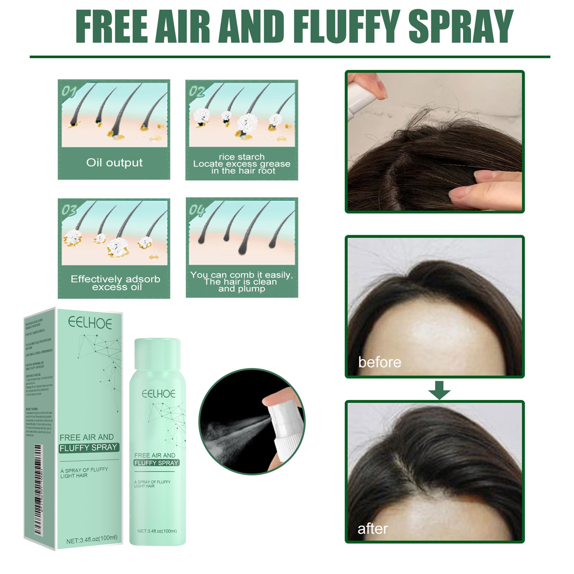 Our leave-in dry hair spray contains aloe vera leaf extract, soluble collagen. It helps to fluff up the roots, prevent oil slippage and refresh the whole day. The way to use it is simple: shake the bottle and spray it on the roots of your hair, 30 cm away from your hair. Massage with your fingertips to loosen the hair so that the powder does not completely touch the hair. You can use a comb to comb the shape, or you can use your hand. After use the hair becomes light, fluffy, does not produce static electricity, raises the hair roots, and creates light hair.